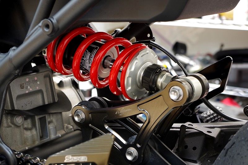 セッティング変更をかましたリアショックを車体に取り付け、