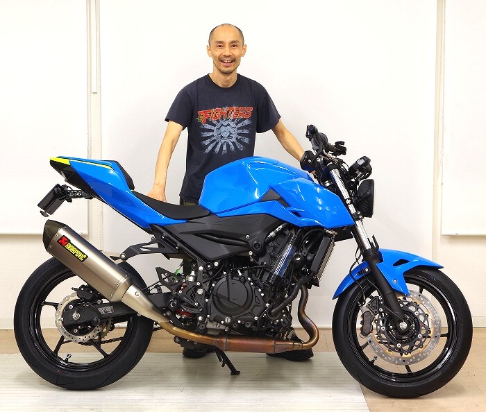 | 仾 That's our BugBro.com-built Z400 streetfighter bike, shown here with BugBro.com shop owner Yamaguchi. This is the one I personally developed and I'm the one selling it. |