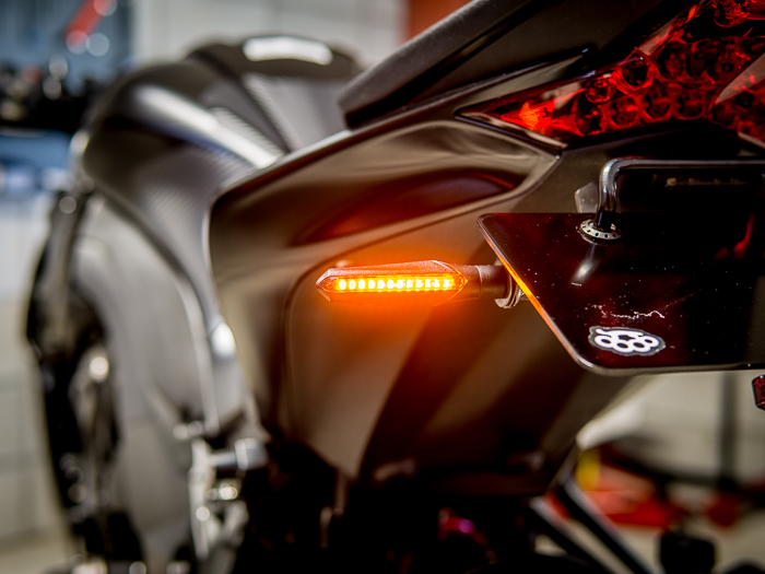 | ★岐阜県H.H様のレポート ABM ジャパン 山口 様 シーケンシャル(流れる)ウィンカーを取り付けましたのでレポートします。 商品 ■ シーケンシャル(流れる)ウィンカー(2個セット) ■ カワサキ用ウィンカー変換ハーネス(左右セット) ● シーケンシャル(流れる)ウィンカー 当初はフロント側の LED ウィンカー・マットブラック・スモークレンズと交換して取り付けるつもりでしたが、せっかくなのでアピール度がより高いリア側に取り付けることにしました。 フロントのLED ウィンカー・マットブラック・スモークレンズと同様シャープな形状でカッコ良いです。前後でウィンカーのイメージも揃えられて満足です。 流れる動きは LED 1チップずつ流れてキレがあって小気味良いですね。 ちなみに 12V 常時入力したら流れる動作後に消灯するのか、点灯しっぱなしなのか疑問に思ってましたが、これ単独で点滅動作する仕様です。もしICリレーがない場合でも 12V を配線すればウィンカー動作させられますね。 ● カワサキ用ウィンカー変換ハーネス(左右セット) 純正ハーネスを加工しなくても良いので助かります。 取扱説明書にしっかりと記載がありますがハーネス色は、黒(ウィンカー:+)・黒/黄(アース:−)です。シーケンシャルウィンカーの配線は黄(+)黒(ー)と逆になってるので注意が必要です。 F型 Z1000 への装着写真を送付いたしますので参考になれば幸いです。 ★バグブロドットコムより返信 この度のお買い上げ、及び画像とレポートのご提供、誠にありがとうございます! これまでのレポート同様、大変美しい画像や動画で感動いたしました! では、今後ともストリートファイター系で色々とカスタムされる際には、是非、バグブロドットコムを宜しくお願い致します! |