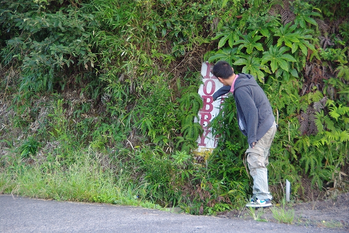 おんもの看板は茂みに隠れ気味です。