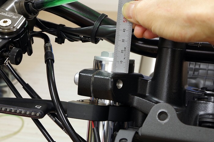 15mm突き出しますとフロントフォークのトップキャップがハンドルに干渉する事から、