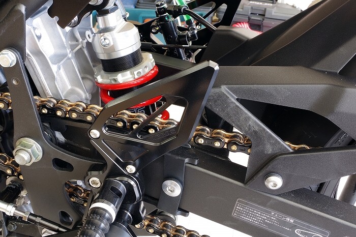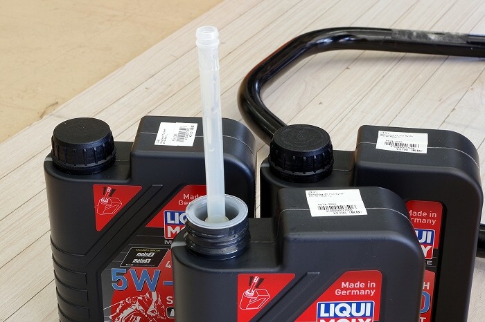 前後にメンテナススタンドをかけた状態でオイルを抜き、