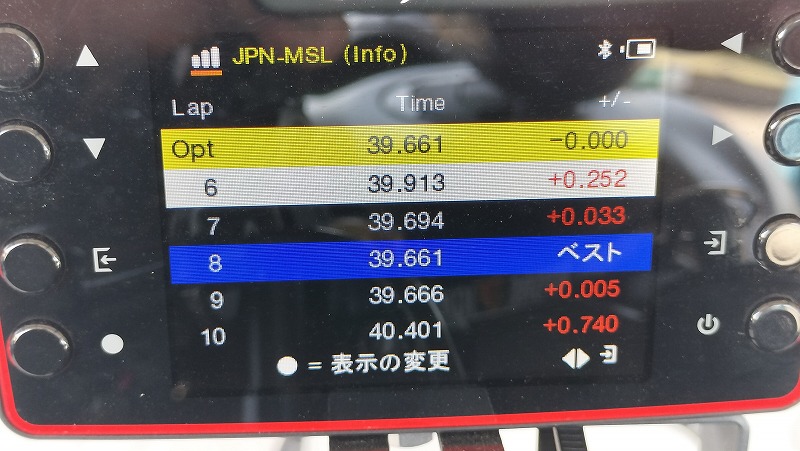 | ・リアショックのスプリング交換は吉と出た ・リアショックのスプリング交換でフロントの安心感も増した ・進入で頑張らず極端な立ち上がり重視でベストタイムも更新出来た ・最終手前の右コーナー立ち上がりでのワイドオープンがタイムアップのキモだと分かった ・3本目にリアスプロケットを50Tから52Tに変えても今後もイケるという感触だった ・初めて3本全ての走行でサブ40(40秒切り)出来た |