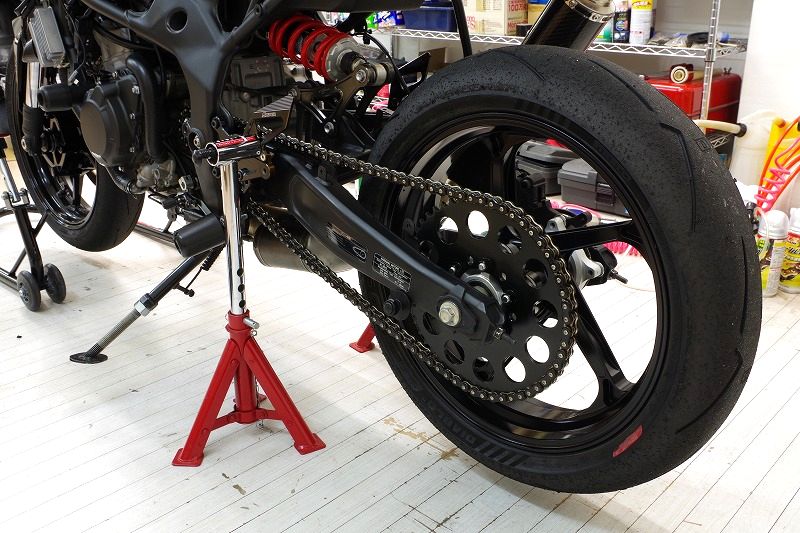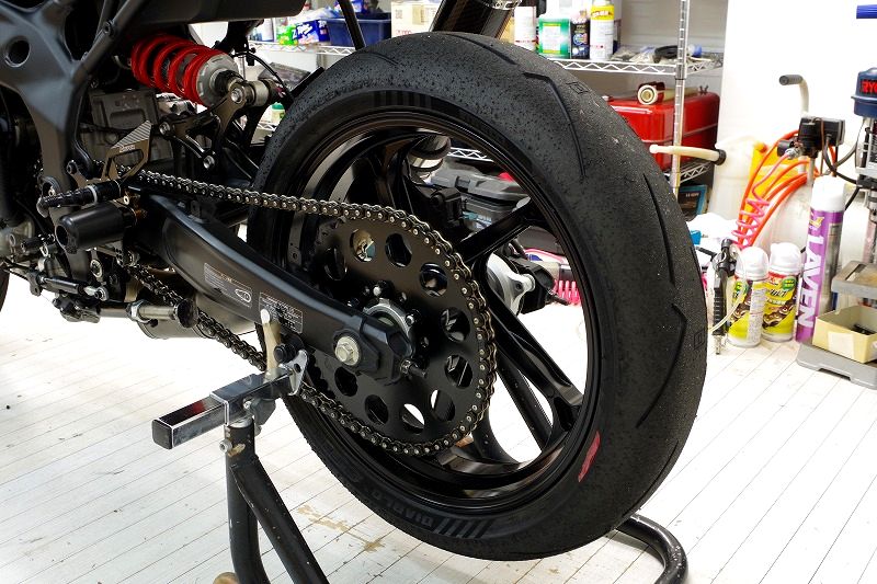 フロントは使い古しの110/70のレーステックRRを履かせた、