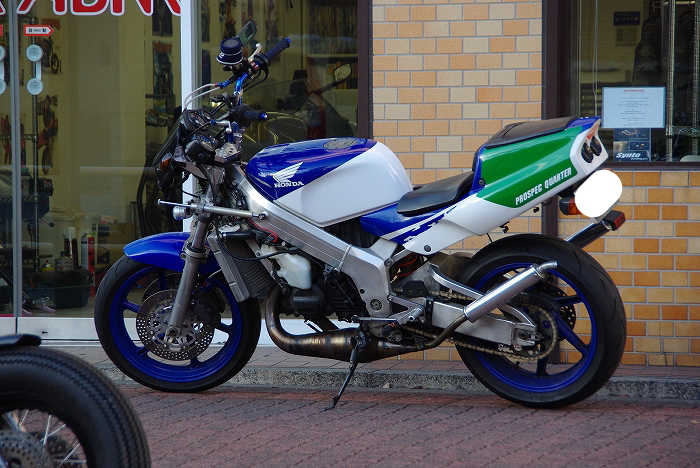 | 「ストリートファイター」というカテゴリーにしっかりとした定義がない事から、我が国においてもその呼び方を自信を持って使う人が素人玄人共にあまり居ない傾向もあるのですが、とりあえずセパハン&モノショックでカウル付きだったバイクをネイキッド&バーハン化すれば、それが「ストリートファイター仕様車」だと、日本の人達もなんとなくザックリと判断し、転倒してカウルが割れてしまったレーサーレプリカなどを、とりあえず走らせられるようにとネイキッド化する事をキッカケに、ストリートファイター仕様車を作ってしまうという事が日本ではありがちなノリなのですが、日本ではそうしたベースマシンには、大抵は250や400のレーサーレプリカがベースになり、更には、日本人、その中でも特に小僧連中は、一般公道での“スリ抜け”を重視する事や、上半身が垂直になってしまうような極端に高いハンドルを好む事から、取り付けるハンドルは、絞りが大きく高さが高いクネクネしたハンドルを装着する事が多く、こうした、中型のレーサーレプリカをベースにしてクネクネしたハンドルを装着したストリートファイターを、当サイトではジャパニーズ・ストリートファイター、通称「ジャパファイ」と呼んでいます。 |